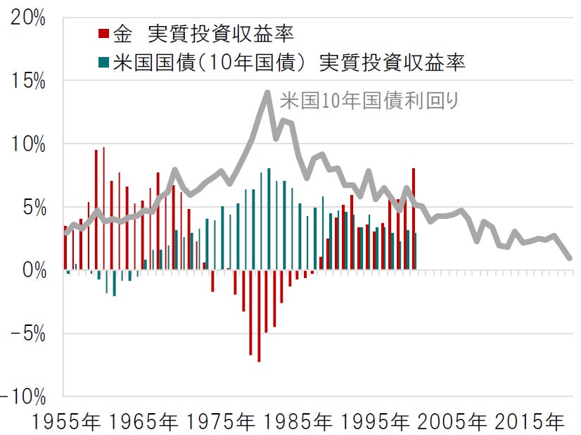 1955年以降の米国国債(10年国債)および金の超長期(20年間)の実質投資収益率注と米国10年国債利回りの関係をみると、利回り水準により、金と米国国債(10年国債)のどちらが優勢か分かれていることがわかります(図表4参照)。注 実質投資収益率:各資産の投資収益から物価上昇の影響を取り除いたもの