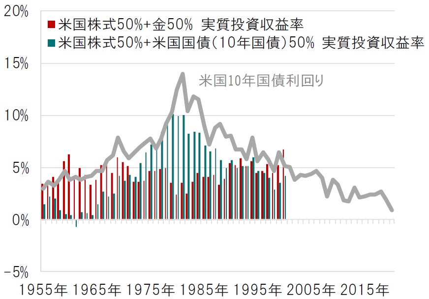 図表5:米国株式50%+米国国債(10年国債)50%と米国株式50%+金50%の実質収益率(20年間、年率化)と米国10年国債利回りの推移