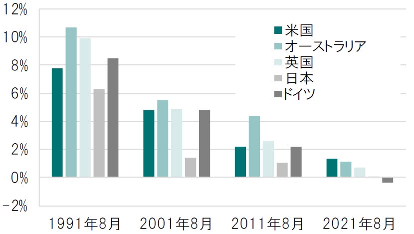 世界経済は、過去30年の間に日本のバブル崩壊やITバブル崩壊、リーマンショック、欧州債務危機、新型コロナウイルスのパンデミック(世界的大流行)などの経済危機を何度も乗り越えてきましたが、そのような中で10年国債利回りは低下傾向が続き、2021年8月には、比較的高い水準にある米国とオーストラリアでも1%超、ドイツはマイナス圏となっています。
