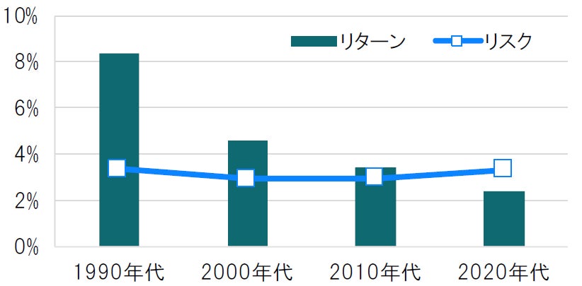※世界国債:FTSE世界国債指数※リターンは10年間のリターンを年率化※リスクは月次リターンの標準偏差を年率化※2020年代:2019年12月末~2021年8月末のデータを使用し計算