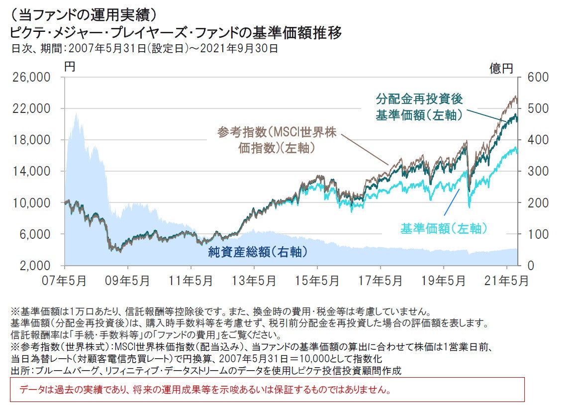また設定来(期間:2007年5月末~2021年9月末)の投資リターンは、引き続き参考指数(世界株式)(以下、世界株式)を上回っています。