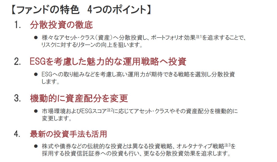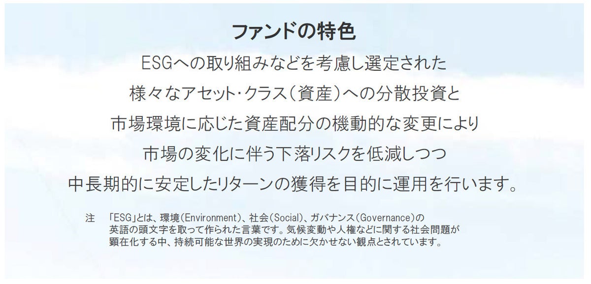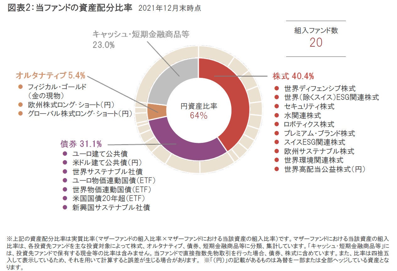 当ファンドでは2021年10月15日の設定以降、ESGへの取り組みなどを考慮し選定された投資戦略への分散投資を基本に、ポートフォリオの構築を進めてきました。2021年12月末時点の組入ファンドの中で、ESGを考慮した組入れの主な例としては、株式部分で、世界(除くスイス)ESG関連株式、水関連株式、スイスESG関連株式、欧州サステナブル株式、世界環境関連株式などがあります。また、債券部分では、世界サステナブル社債や新興国サステナブル社債などがあります。