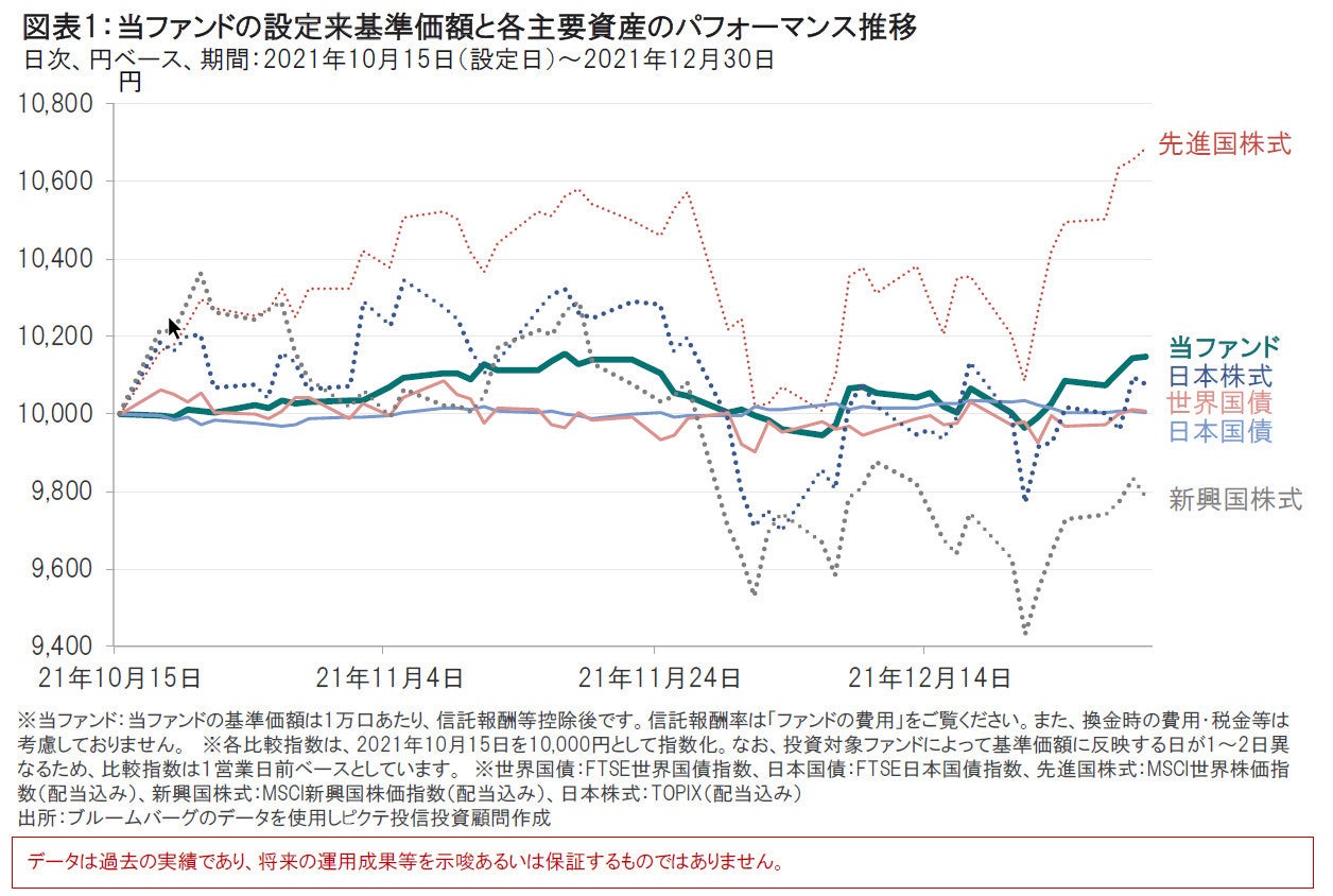 こうした市場環境下、モンド(以下、当ファンド)の基準価額は2021年10月15日の設定以降、相対的に安定したパフォーマンスを維持し続けました。2021年12月30日時点の基準価額は10,147円、設定来で+147円(+1.47%)の上昇となりました。特に、組入れ株式資産からのプラス寄与が大きく貢献しました。