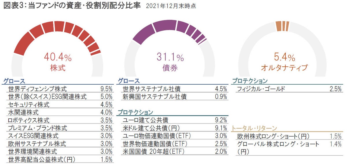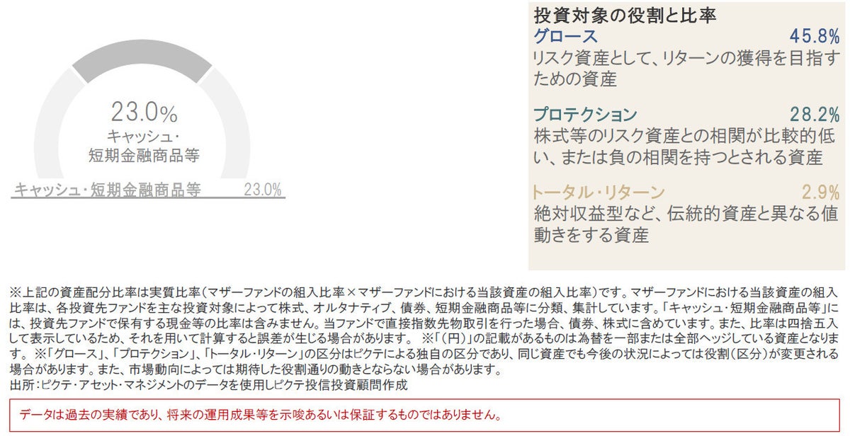 また、当ファンドでは、株式や債券といったアセット・クラス(資産)だけではなく、個々の投資対象が運用戦略全体の中で「成長(=グロース)」や「保全(=プロテクション)」など果たす役割の違いも考慮した上で、細かく分散を行いポートフォリオを構築しています。