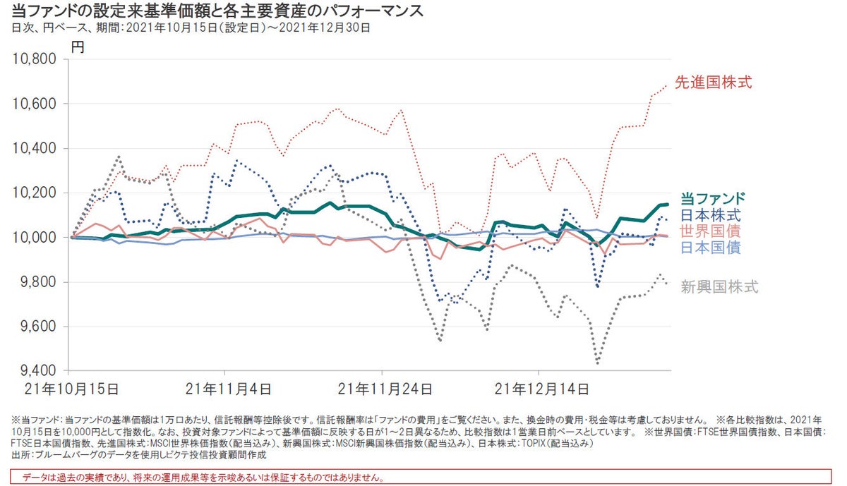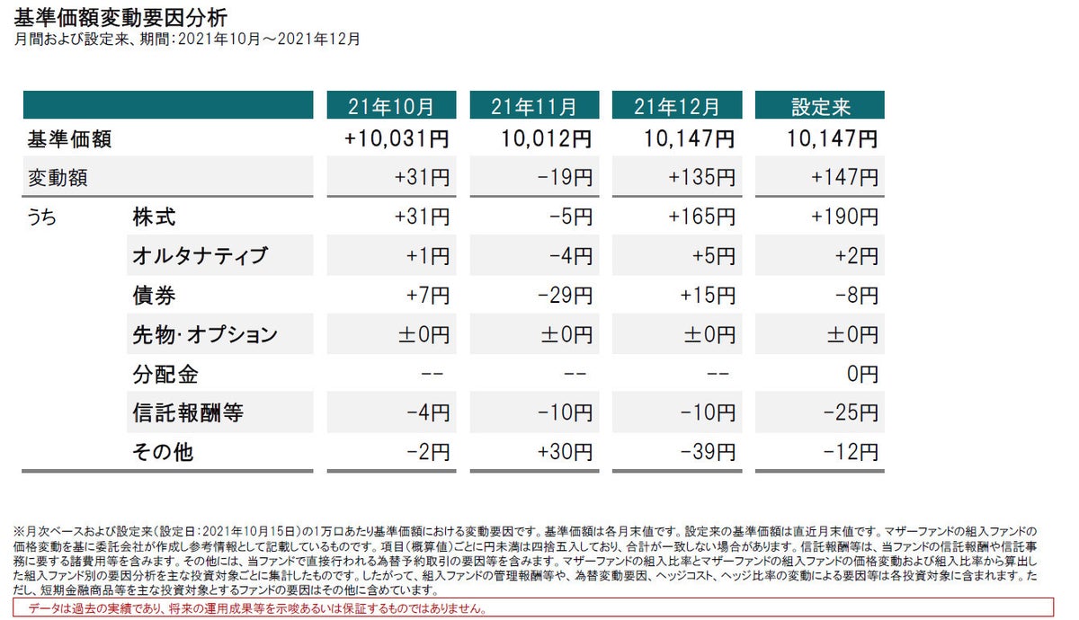 当ファンドの基準価額は設定来、主要株式市場が大きく下落した局面でも下落幅を抑えつつ、相対的に安定した推移となっています。2021年12月30日の基準価額は10,147円となり、設定来で+147円(+1.47%)の上昇となりました。