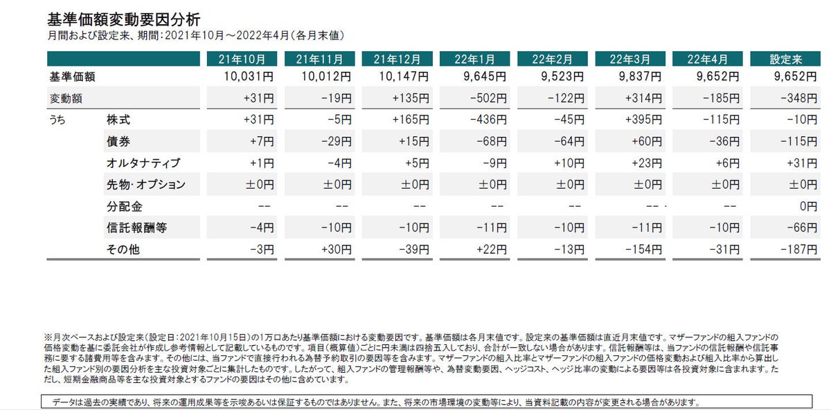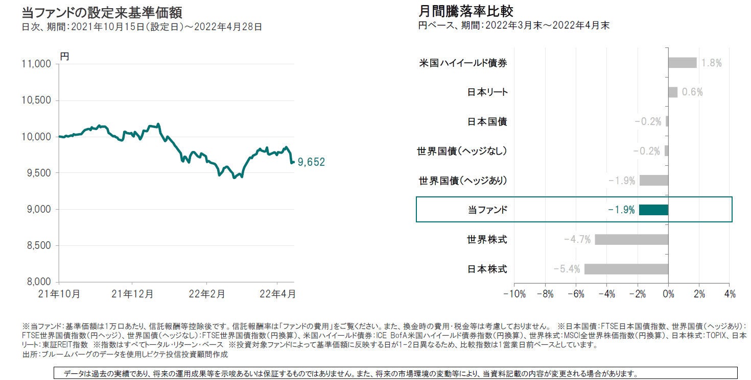 こうした市場環境下、当ファンドの2022年4月28日の基準価額は9,652円となり、前月末比で-185円(-1.88%)の下落となりました。