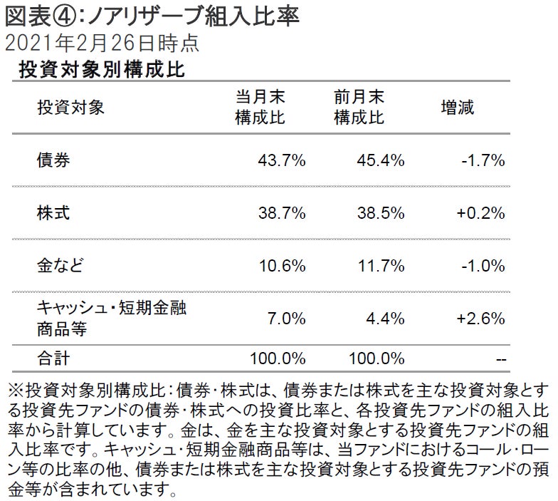 2021年2月26日のノアリザーブの基準価額は、前月末比で-24円の9,375円となりました。同期間の主な変動要因は、株式が+92円、債券が-100円、金が-26円、為替が+38円、分配金が-20円でした。基準価額(分配金再投資後)は前月末比-0.05%の下落となっています(図表①参照)。なお、円資産の比率は、前月末より低下し、60.9%となりました。