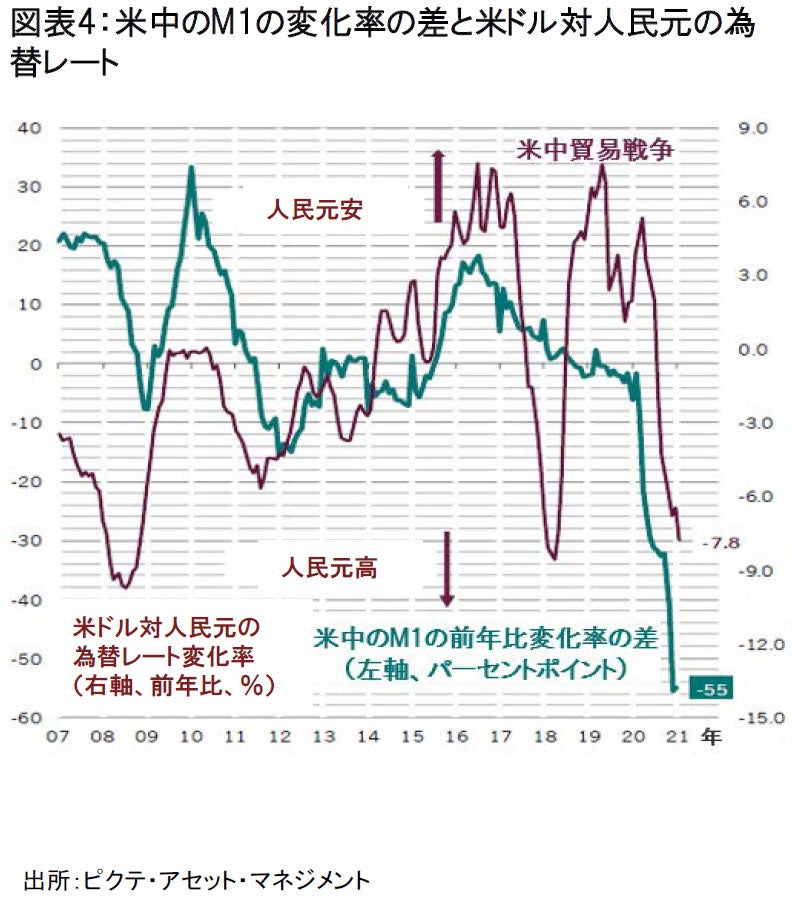 また、人民元高による追加的なリターンが期待できることも注目されます。米国のマネーサプライの伸びが中国のマネーサプライの伸びを上回る状況では、対ドルの人民元高の継続が見込まれます。足元でこの格差は、拡大の一途をたどっており、ピクテでは、今後も、人民元高が進行する公算が大きいと考えています。これを受け、現地通貨建て新興国債券への注目を継続します。
