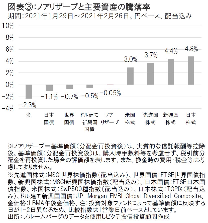 このような状況下、ノアリザーブの基準価額(分配金再投資後)は小幅下落となりました(図表③参照) 。