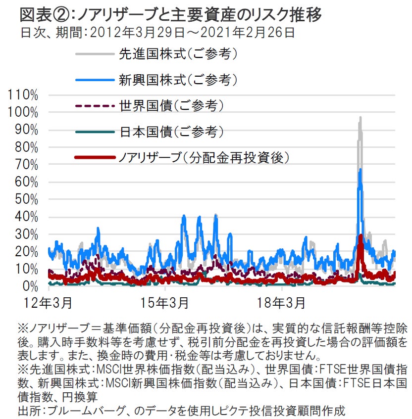 ノアリザーブの設定来のリスクは、株式等と比較すると相対的に低位に推移してきました。当ファンドのリスク(価格変動)水準は、新型コロナウイルスの影響で金融市場の価格変動が大きくなった3月以降、高い水準にありましたが、足元ではほぼ新型コロナウイルス感染拡大前の水準まで低下しています(図表②参照)。