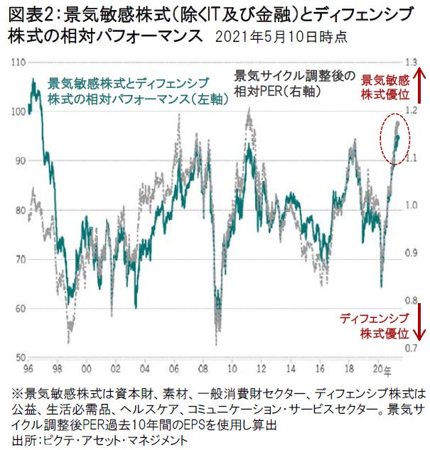 経済成長の鈍化は、景気敏感株式に対する逆風になると考えています。ハイテク銘柄を除いた景気敏感セクターのバリュエーションはディフェンシブセクターのバリュエーションを約15%上回って推移しています(図表2)。両セクターのPER格差は、急回復した製造業の業績回復の勢いに陰りが見え始めれば、縮小に転じる可能性があると考えています。