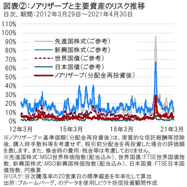 ノアリザーブの設定来のリスクは、株式等と比較すると相対的に低位に推移してきました。当ファンドのリスク(価格変動)水準は、新型コロナウイルスの影響で先行き不透明感が高まった2020年3月に急上昇しましたが、足元では新型コロナウイルス感染拡大前の水準まで低下しています(図表②参照)。