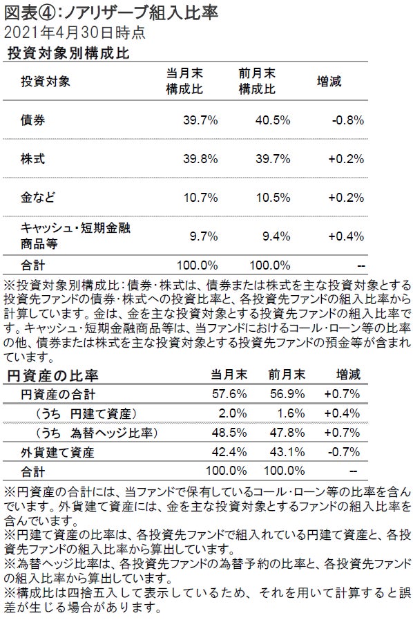 2021年4月30日のノアリザーブの基準価額は、前月末比で+181円の9,552円となりました。同期間の主な変動要因は、株式が+191円、債券が+22円、金が+35円、為替が-36円、分配金が-20円でした。基準価額(分配金再投資後)は前月末比+2.15%の上昇となっています(図表①参照)。なお、円資産の比率は、前月末より上昇し、57.6%となりました。