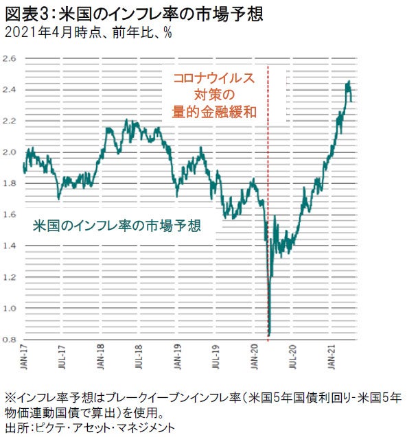 市場は、金融緩和の継続を主張し続けているFRBの予想に先立って利上げを織り込んでいます。一方、FRBは、時期尚早の利上げを余儀なくされる状況を回避したいと考えていると見ています。利上げまでの猶予期間を確保するため、量的緩和(資産買入)プログラムの縮小を始めるものと考えます。量的緩和の縮小は、2022年の早い時期までは行われないとの見方が一般的ですが、早ければ6月の連邦公開市場委員会(FOMC)、或いは8月のジャクソンホール会議で発表される可能性もあると考えています。もっとも、期待インフレ率(図表3)が上昇し続けた場合、FRBは「低金利の長期化」を正当化することは至難の業であると認識することになるだろうと考えています。