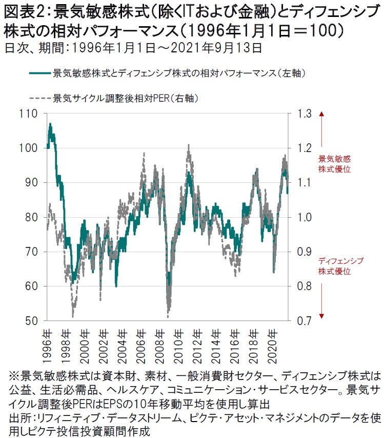 足元の世界経済の成長鈍化は、景気敏感株に影響を及ぼしています。足元の数ヵ月間、景気敏感株がディフェンシブ株に出遅れているのは、経済指標が、市場予想を大幅に上回る状況が見られないためです。こうした状況は当面続くと思われることから、日本株式をやや弱気にみており、景気敏感株の削減を行いました。日本経済は、危機的状況に直面しています。新型コロナウイルスの感染が急拡大する中、ワクチン接種が他の先進国に大きく出遅れ、経済活動や消費者心理に影響が及んでいるからです。また、民間部門の信用創造が振るわず、9年ぶりの低水準を付ける状況に直面するなど、日本銀行も景気浮揚に苦慮しています。ピクテの景気先行指標は3ヵ月連続で低下していますが、日本は中国の景気減速と外需縮小にとりわけ脆弱であると思われることから、先行きは明るいとはいえません。こうした状況を勘案し、日本株式についてはやや弱気にみています。