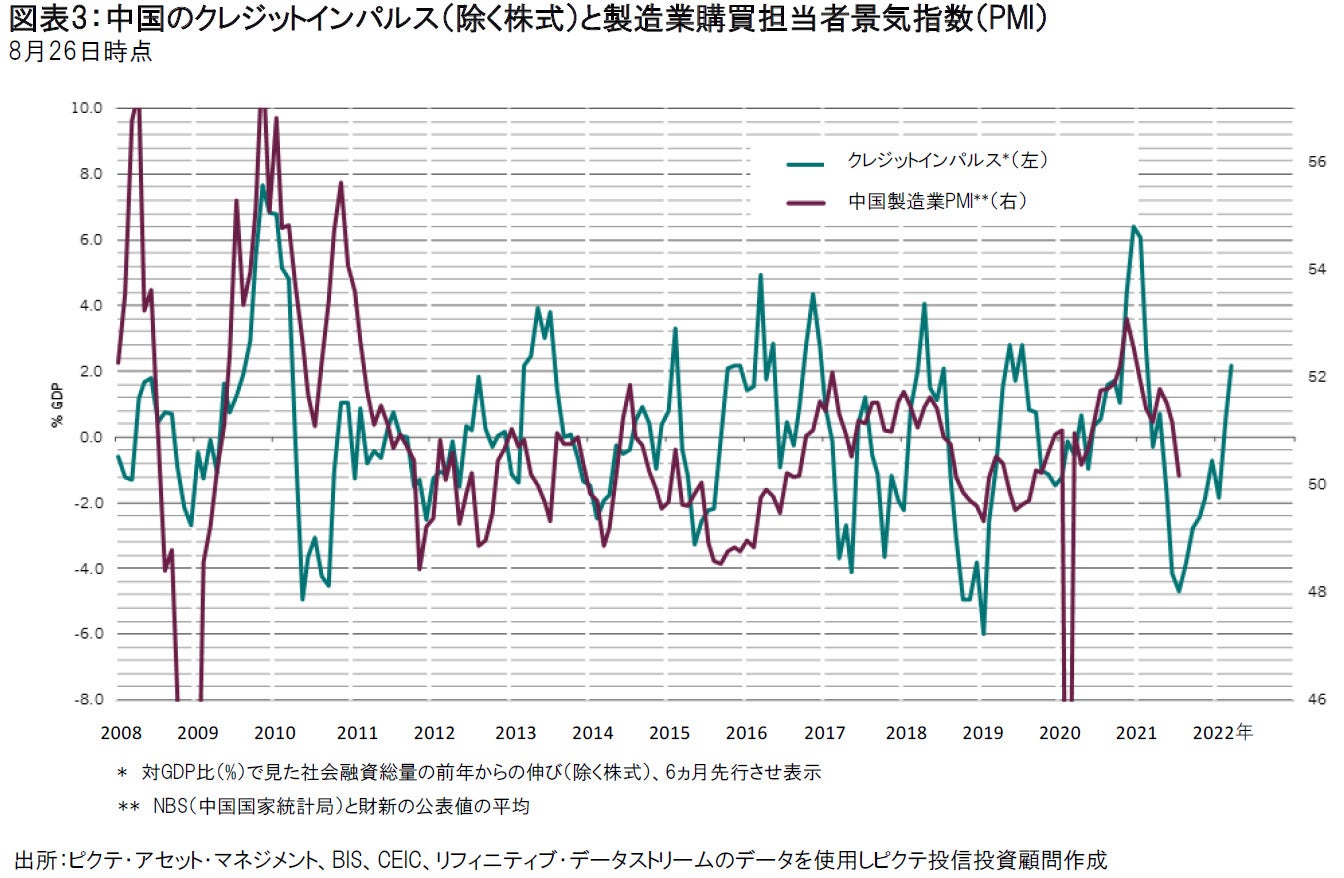 中国債券は、世界的な低金利環境下においても魅力的な投資機会を提供する資産と考えています。中国債券はボラティリティが低く、流動性が拡大基調にあることに加え、10年国債利回りも2.8%台と魅力的です。中国では、新型コロナウイルスの感染再拡大を受けた一部地域のロックダウンや旅行規制に起因して消費の低迷が続いており、ピクテの景気先行指数は低下基調を辿っています。このような状況を受けて、中国人民銀行が金融政策において、緩和的な姿勢を強めていることも、債券市場の追い風です。同行は、経済の減速に対応し、7月に預金準備率を50ベーシスポイント(0.5%)引き下げており、一段の金融緩和の準備を整えているものと思われます。量的金融緩和の縮小を検討しているFRBとは対照的な状況です。ピクテのテクニカル指標も強気のトレンドを示唆しています。