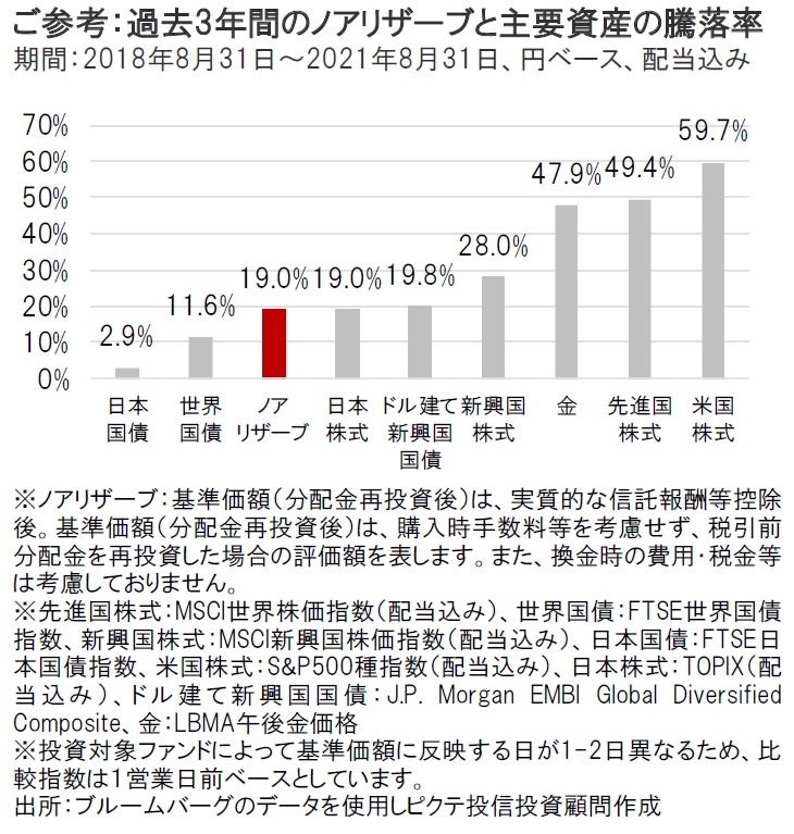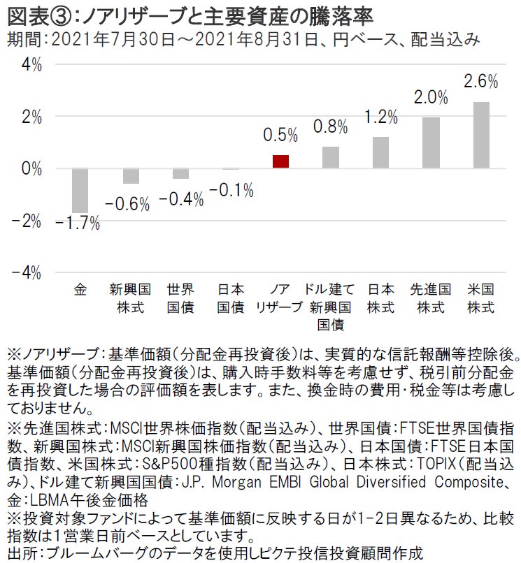 2021年8月は、米国株式や先進国の株式やドル建て新興国国債などが上昇しました(円ベース)。一方、金や新興国株式、先進国の国債などは下落しました(円ベース)。このような状況下、ノアリザーブの基準価額(分配金再投資後)は上昇しました(図表③参照) 。