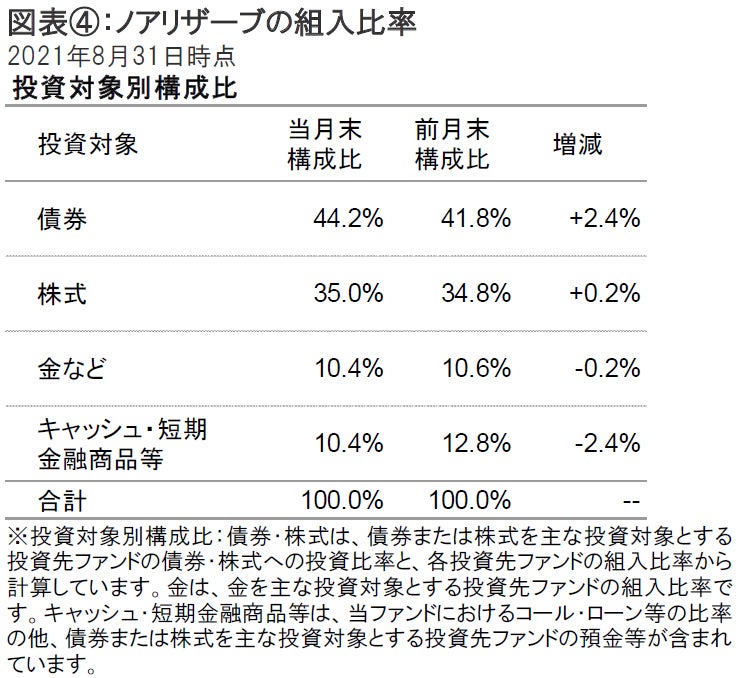 2021年8月31日のノアリザーブの基準価額は、前月末比で+28円の9,679円となりました。同期間の主な変動要因は、株式が+67円、債券が+1円、金が-15円、為替が+5円、分配金が-20円でした。基準価額(分配金再投資後)は前月末比+0.50%の上昇となっています(図表①参照)。なお、円資産の比率は、前月末より低下し、59.3%となりました。