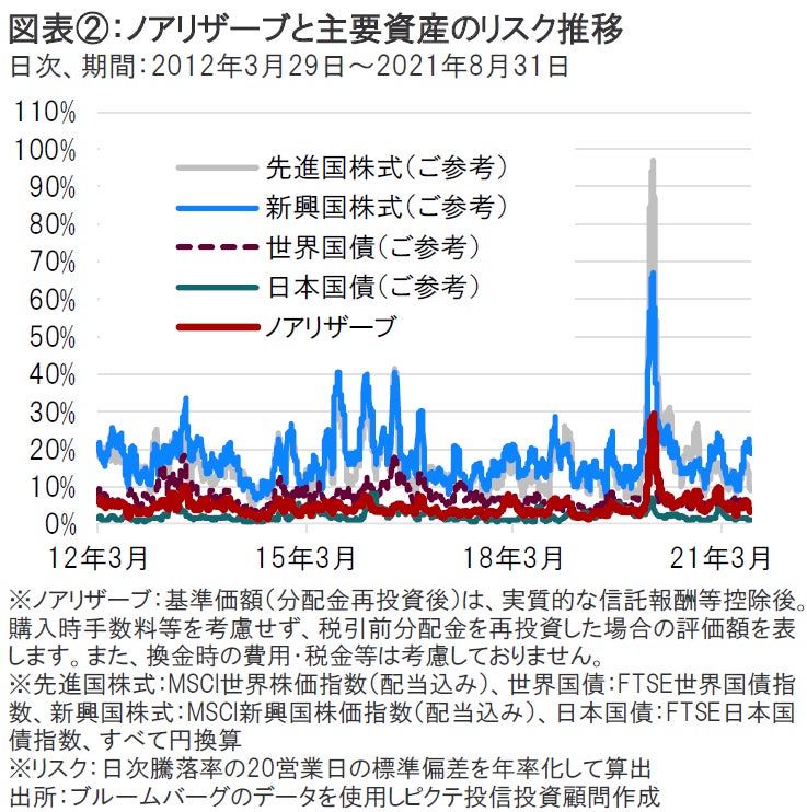 ノアリザーブの設定来のリスクは、株式等と比較すると相対的に低位に推移してきました。リスク(価格変動)水準は、新型コロナウイルスの影響で先行き不透明感が高まった2020年3月に急上昇しましたが、足元では新型コロナウイルス感染拡大前の水準まで低下しています(図表②参照)。