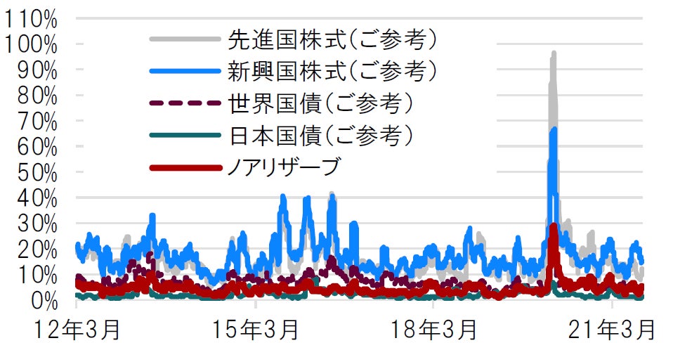 ノアリザーブの設定来のリスクは、株式等と比較すると相対的に低位に推移してきました。リスク(価格変動)水準は、新型コロナウイルスの影響で先行き不透明感が高まった2020年3月に急上昇しましたが、足元では新型コロナウイルス感染拡大前の水準まで低下しています(図表②参照)。