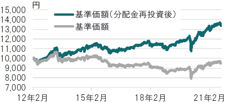 ※基準価額は1万口あたりで表示しています。※基準価額は、実質的な信託報酬等控除後。基準価額(分配金再投資後)は、購入時手数料等を考慮せず、税引前分配金を再投資した場合の評価額を表します。また、換金時の費用・税金等は考慮しておりません。