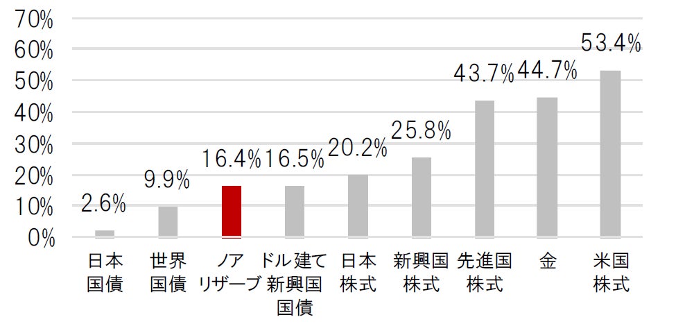 ※先進国株式:MSCI世界株価指数(配当込み)、世界国債:FTSE世界国債指数、新興国株式:MSCI新興国株価指数(配当込み)、日本国債:FTSE日本国債指数、米国株式:S&P500種指数(配当込み)、日本株式:TOPIX(配当込み)、ドル建て新興国国債:J.P. Morgan EMBI Global Diversified Composite、金:LBMA午後金価格
