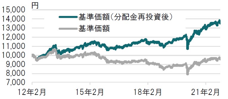 ※基準価額は1万口あたりで表示しています。※基準価額は、実質的な信託報酬等控除後。基準価額(分配金再投資後)は、購入時手数料等を考慮せず、税引前分配金を再投資した場合の評価額を表します。また、換金時の費用・税金等は考慮しておりません。