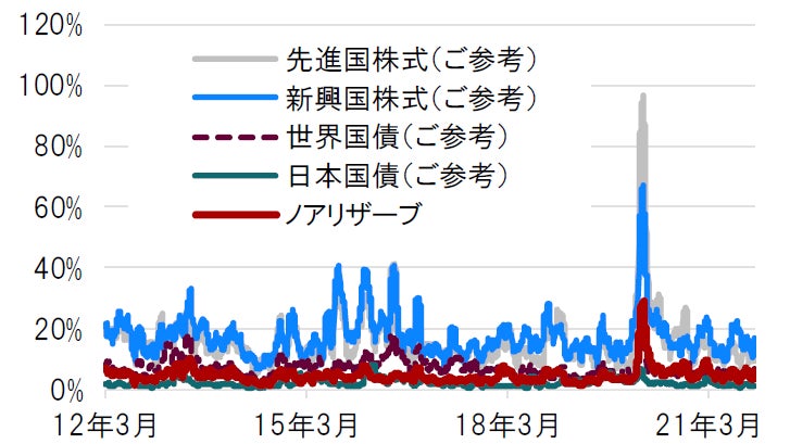ノアリザーブの設定来のリスクは、株式等と比較すると相対的に低位に推移してきました。リスク(価格変動)水準は、新型コロナウイルスの影響で先行き不透明感が高まった2020年3月に急上昇しましたが、足元では新型コロナウイルス感染拡大前の水準まで低下しています(図表②参照)。