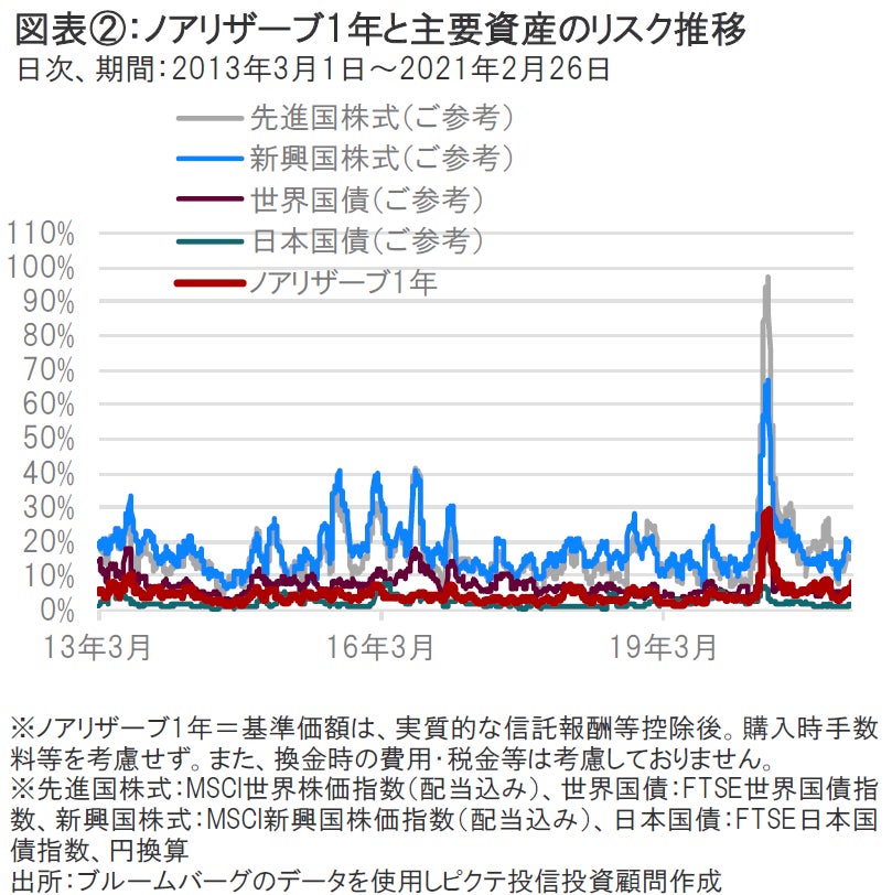 ノアリザーブ1年の設定来のリスクは、株式等と比較すると相対的に低位に推移してきました。当ファンドのリスク(価格変動)水準は、新型コロナウイルスの影響で金融市場の価格変動が大きくなった3月以降、高い水準にありましたが、足元ではほぼ新型コロナウイルス感染拡大前の水準まで低下しました。(図表②参照)