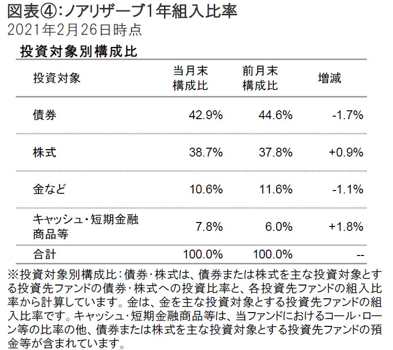 2021年2月26日のノアリザーブ1年の基準価額は、前月末比で-8円の12,330円となりました。同期間の主な変動要因は株式が+118円、債券が-129円、金が-34円、為替が+50円でした。基準価額は前月末比-0.06%の下落となりました(図表①参照)。なお、円資産の比率は、前月末より低下し61.3%となりました。