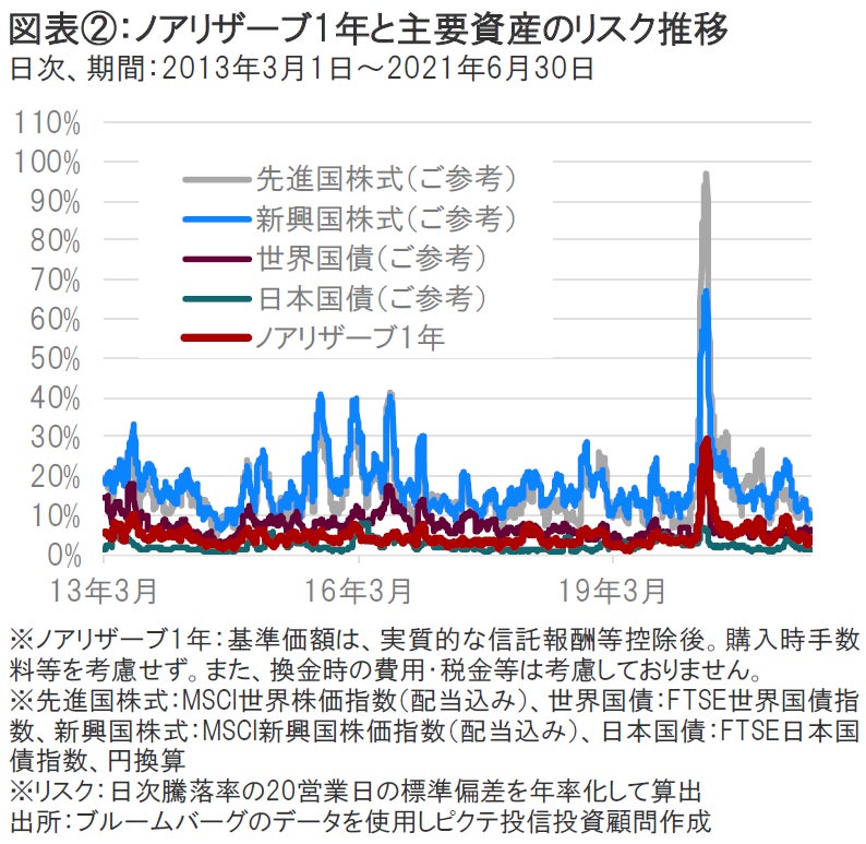 ノアリザーブ1年の設定来のリスクは、株式等と比較すると相対的に低位に推移してきました。当ファンドのリスク(価格変動)水準は、新型コロナウイルスの影響で先行き不透明感が高まった2020年3月に急上昇しましたが、足元では新型コロナウイルス感染拡大前の水準まで低下しています(図表②参照)。