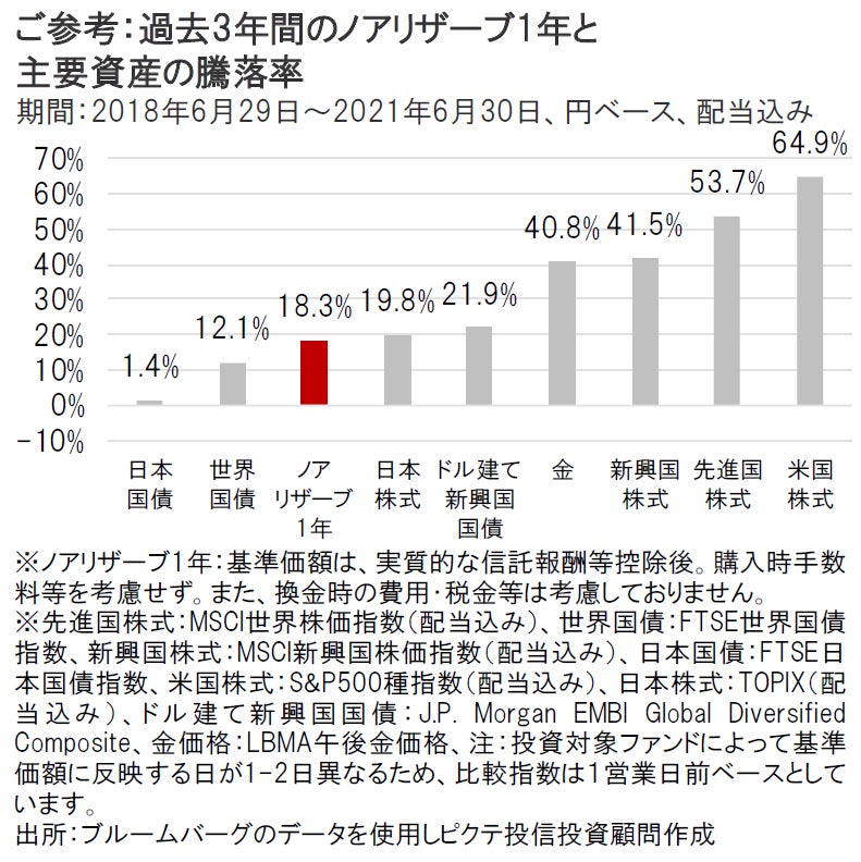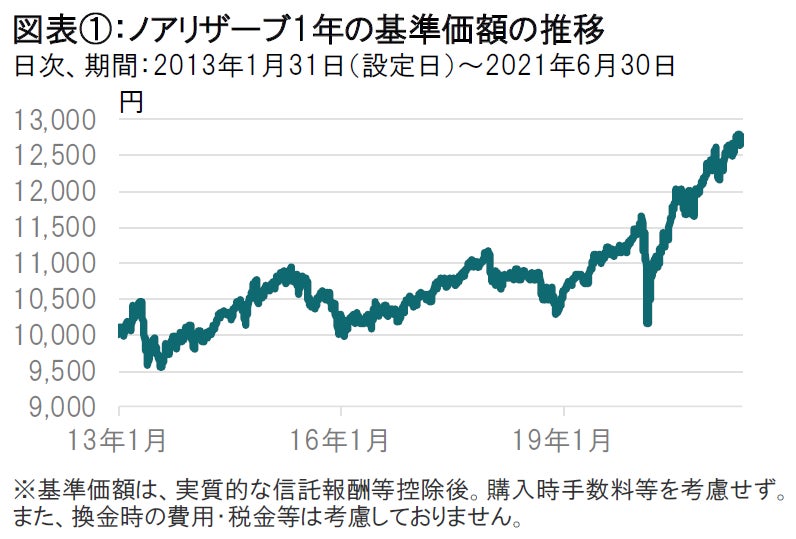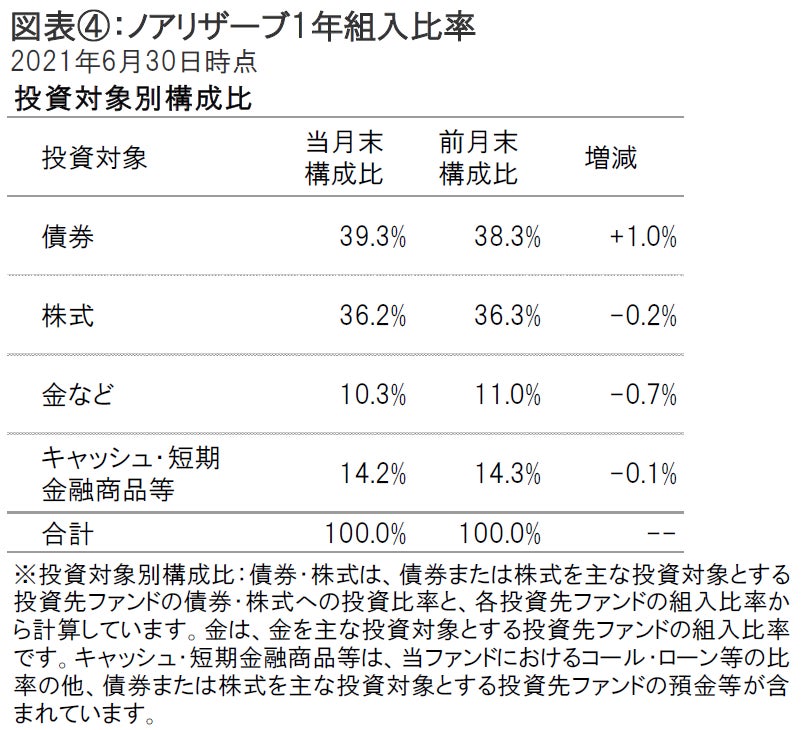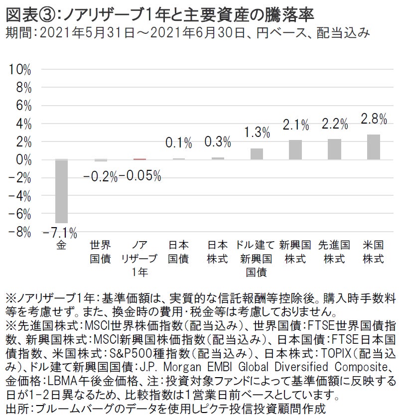 2021年6月は、世界の株式市場は概ね続伸、先進国の債券は小幅な動き、金は大きく下落しました(円ベース)。このような状況下、ノアリザーブ1年の基準価額は小幅に下落しました(図表③参照) 。