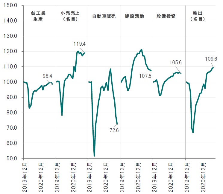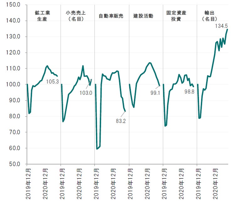 ※データの表示期間は設備投資と輸出(名目)は2019年12月~2021年8月。建設活動は2019年12月~2021年10月。それ以外はいずれも2019年12月~2021年9月。