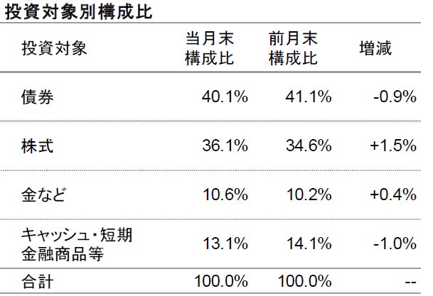 ※投資対象別構成比:債券・株式は、債券または株式を主な投資対象とする投資先ファンドの債券・株式への投資比率と、各投資先ファンドの組入比率から計算しています。金は、金を主な投資対象とする投資先ファンドの組入比率です。キャッシュ・短期金融商品等は、当ファンドにおけるコール・ローン等の比率の他、債券または株式を主な投資対象とする投資先ファンドの預金等が含まれています。