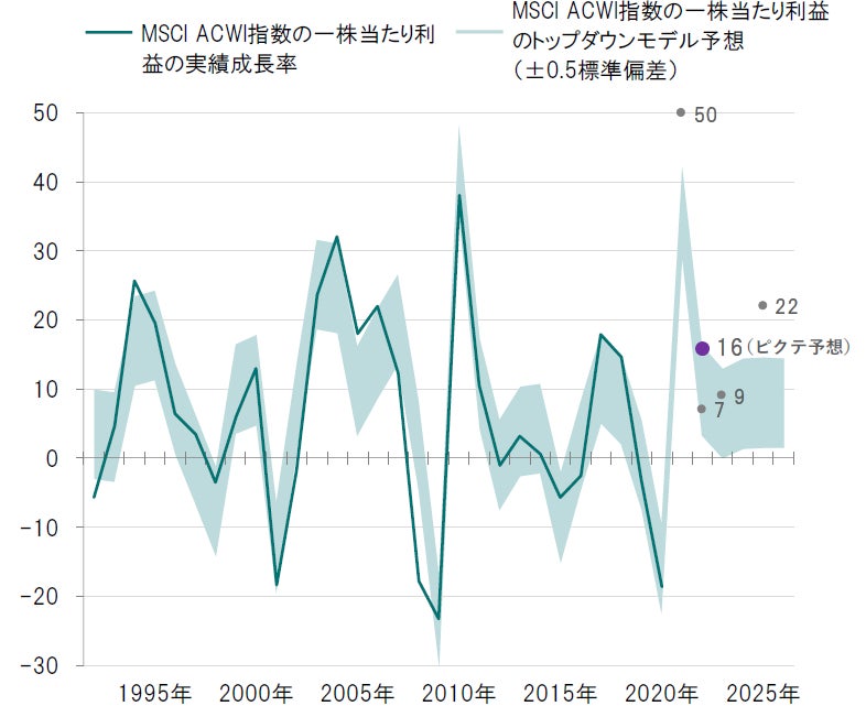 図表1:MSCI ACWI指数の一株当たり利益成長率(実績とピクテ予想)