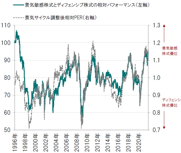 ※景気敏感株式は資本財、素材、一般消費財セクター、ディフェンシブ株式は公益、生活必需品、ヘルスケア、コミュニケーション・サービスセクター。景気サイクル調整後PERはEPSの10年移動平均を使用し算出