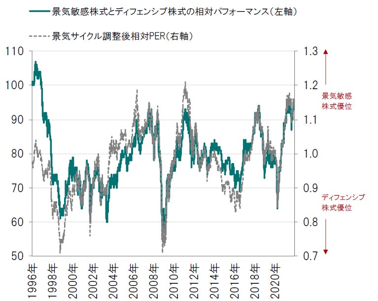 ※景気敏感株式は資本財、素材、一般消費財セクター、ディフェンシブ株式は公益、生活必需品、ヘルスケア、コミュニケーション・サービスセクター。景気サイクル調整後相対PERはEPSの10年移動平均を使用し算出