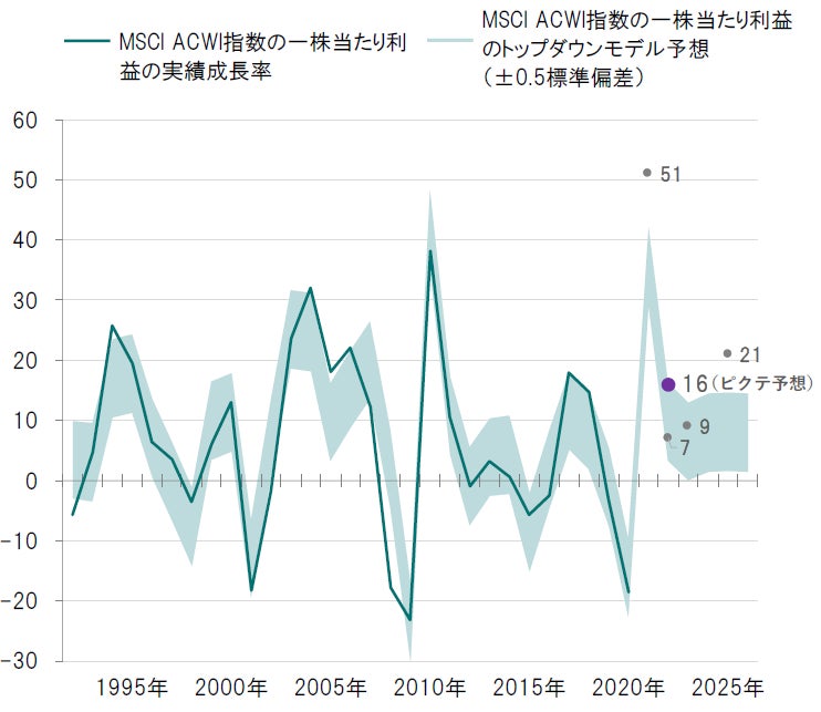図表1:MSCI ACWI指数の一株当たり利益成長率(実績とピクテ予想)