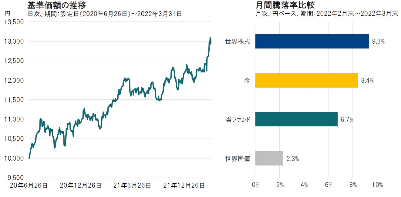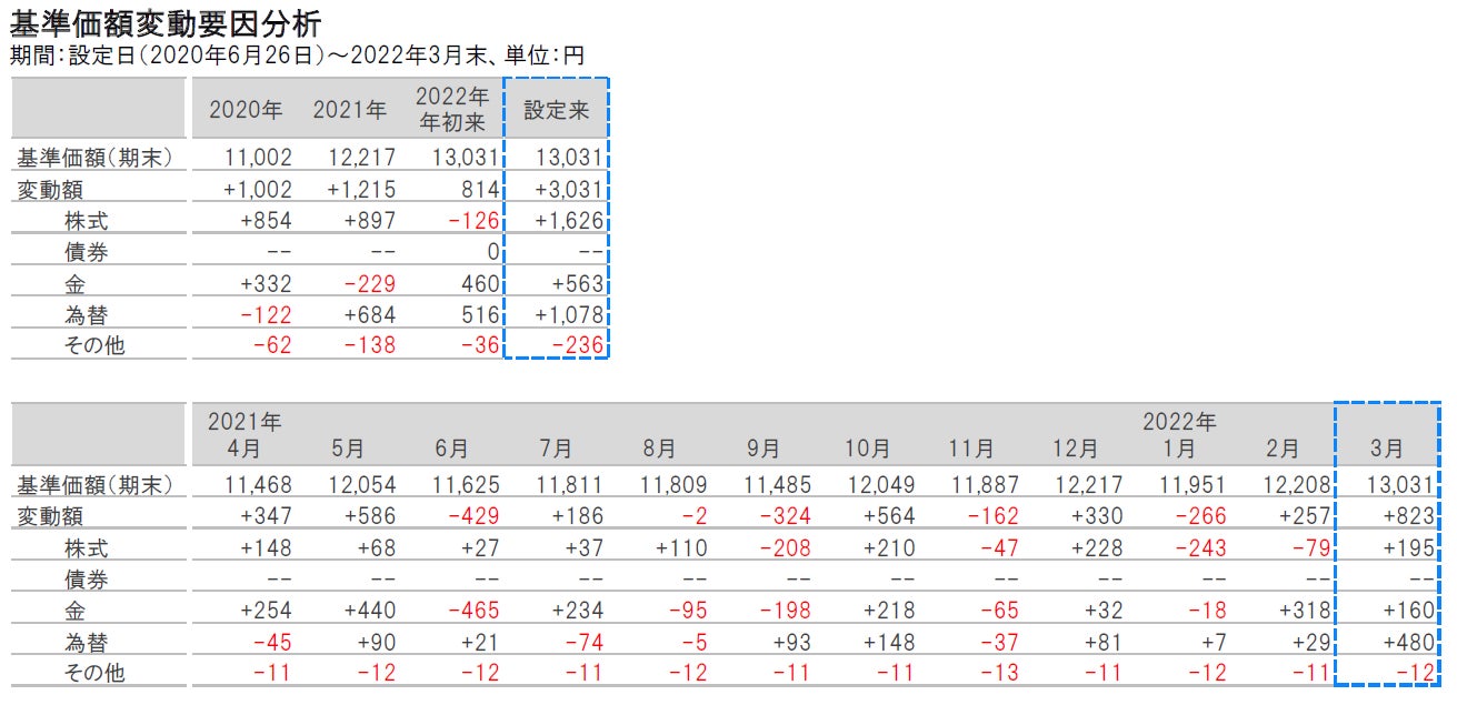 2022年3月は、株式、金、為替がともにプラス寄与となり、基準価額が上昇しました。