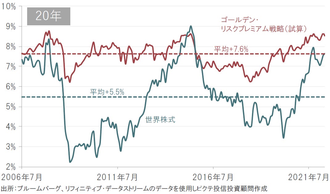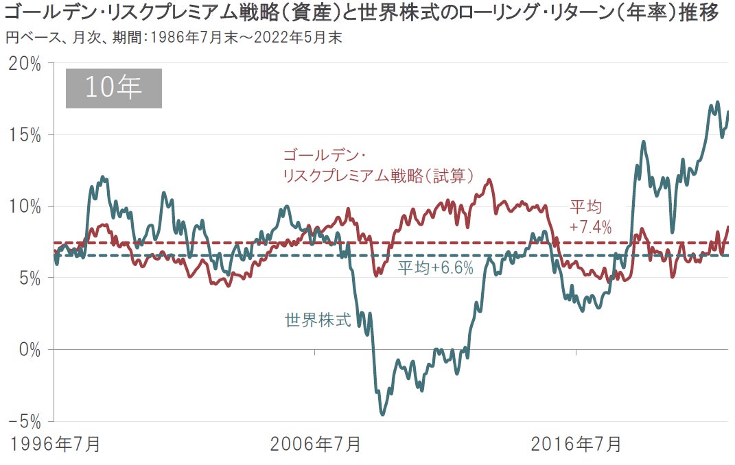 ゴールデン・リスクプレミアム戦略(試算)を、10年および20年保有した場合の騰落率(ローリング・リターン)の推移を見ると、どちらの場合もゴールデン・リスクプレミアム戦略(試算)が世界株式よりも平均騰落率が高く、かつ相対的に安定した騰落率となっています。