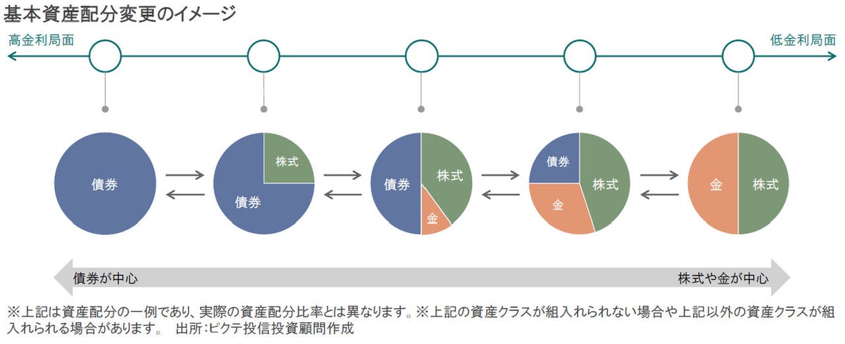 当ファンドは低金利の時代は株式や金、高金利の時代は債券を中心に投資