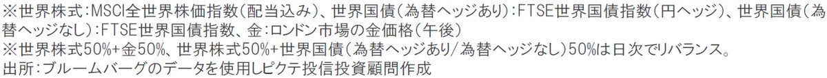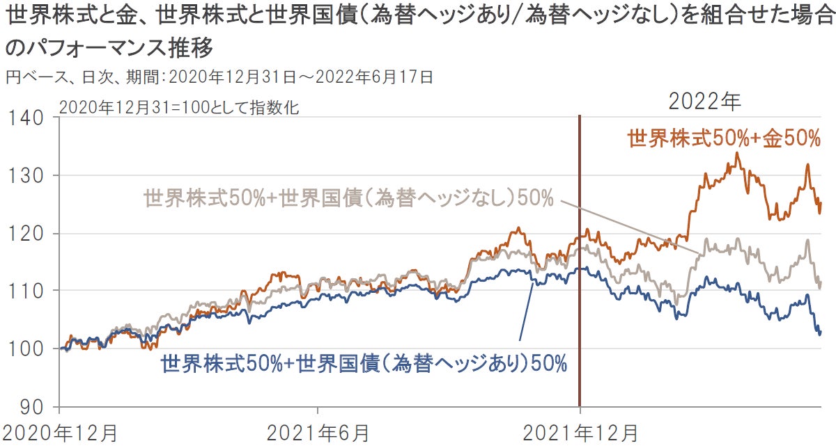 このような環境下、世界株式と世界国債(為替ヘッジあり/為替ヘッジなし)、世界株式と金を組合せて保有した場合のパフォーマンスを比較すると、世界株式50%+金50%は、伝統的な資産の組合せである世界株式50%+世界国債(為替ヘッジあり/為替ヘッジなし)50%を上回っています。