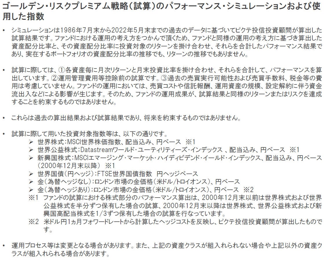 当ファンドは、市場環境に応じて魅力的なリスクプレミアム注が期待できる資産を組合わせる/入れ替えるファンドです。現在は、低金利環境で相対的に魅力が高い株式と金を半分ずつ保有するという資産配分で運用を行っており、先に挙げたとおり、現状のインフレ環境下で債券に比べ金が相対的に好調なパフォーマンスとなっています。注 リスクプレミアムとは、リスク資産の期待リターンにおいて価格変動リスクの対価とみなされる部分のことを意味し、無リスクの資産に対して期待するリスク資産のリターンの上乗せ分を指します。