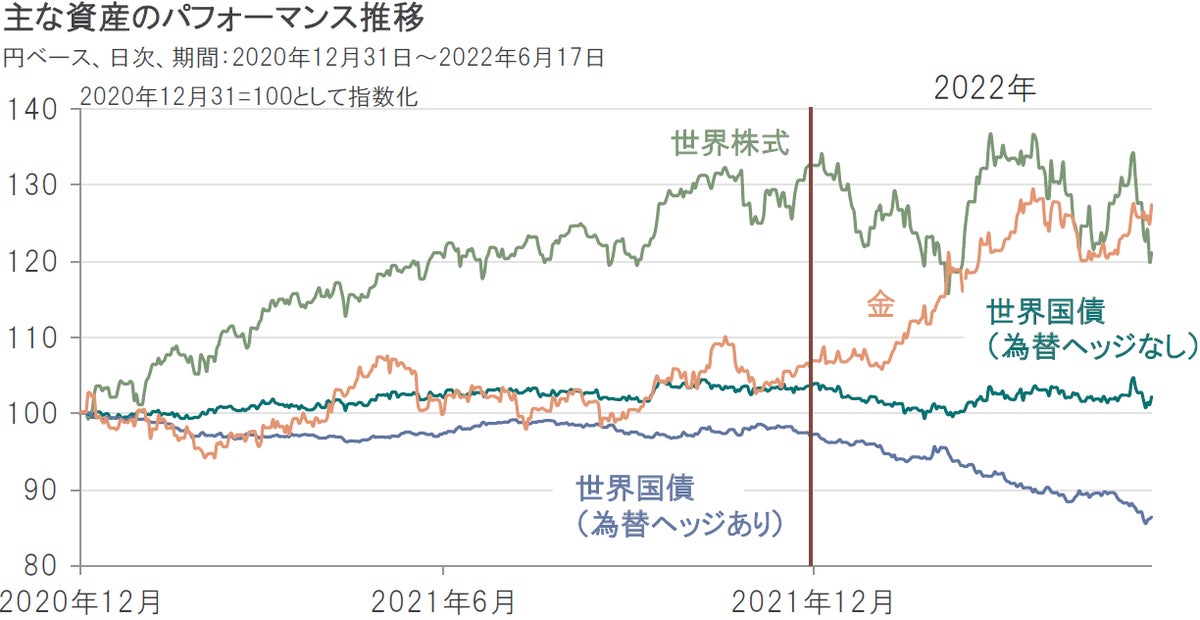 世界の主な資産(世界株式、世界債券(為替ヘッジあり/為替ヘッジなし)、金)について、インフレ率の上昇が顕著となった2021年以降のパフォーマンス(円ベース)を比較すると、世界株式と金は上昇した一方、世界国債(為替ヘッジなし)は横ばい、世界国債(為替ヘッジあり)は下落しています。
