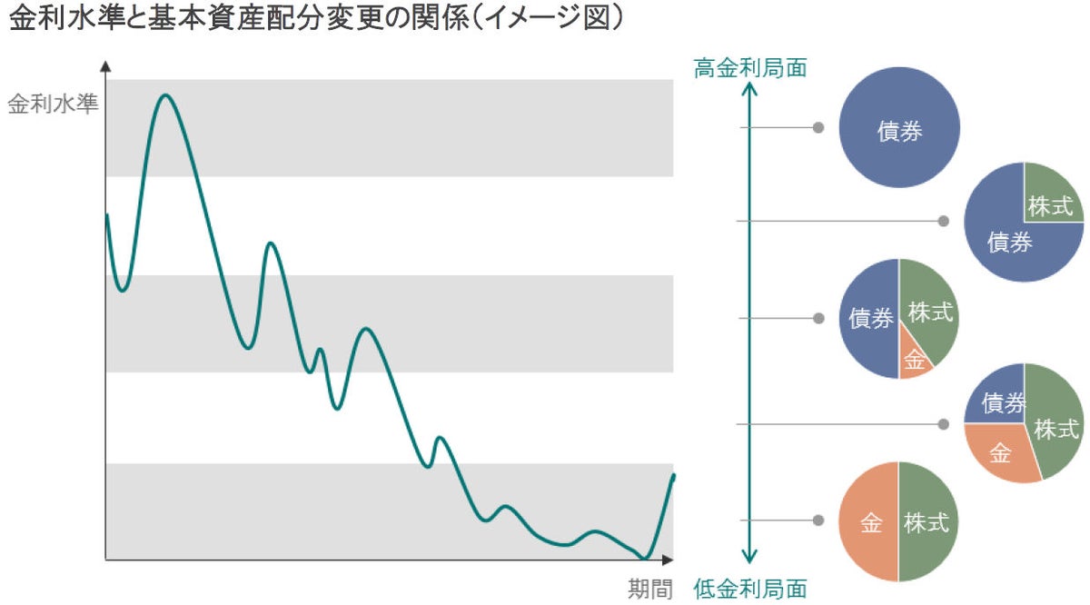 なお、当ファンドは現在の市場環境では株式と金で運用を行っていますが、今後、金利の上昇など市場環境の変化により債券の魅力が高まった場合は、債券を組入れるなど、市場環境に応じて魅力的なリスクプレミアムが期待できる資産を組合わせる方針です。