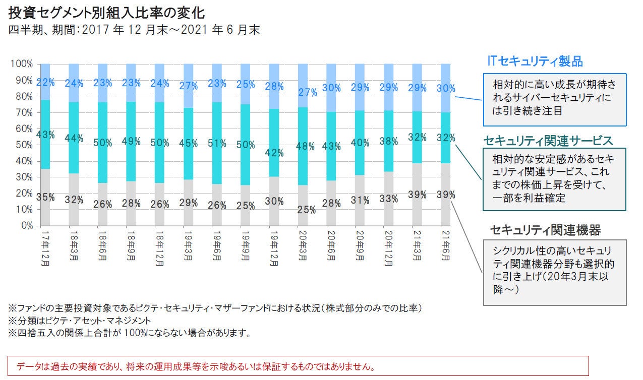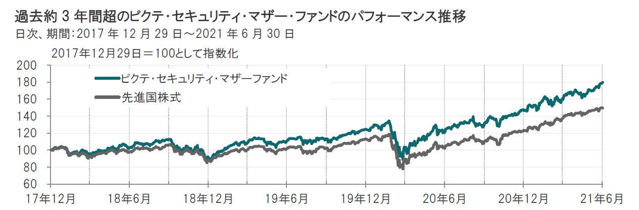 2021年年初来のピクテ・セキュリティ・マザーファンドの基準価額は、株式市場における注目セクター・銘柄が目まぐるしく変化する中ではありましたが、引き続き上昇基調となり、先進国株式の平均を若干上回りました(2021年6月末時点)。セキュリティ関連株式は幅広い分野に存在しており、中長期的に成長が期待できるとの見通しを持っていますが、株式市場には変調の兆しもみられており、運用に際しては銘柄選別をよりいっそう慎重に行う方針です。また、世界的な景気回復で恩恵を大いに受けると期待される景気敏感銘柄の組入比率も選択的に引き上げていきます。