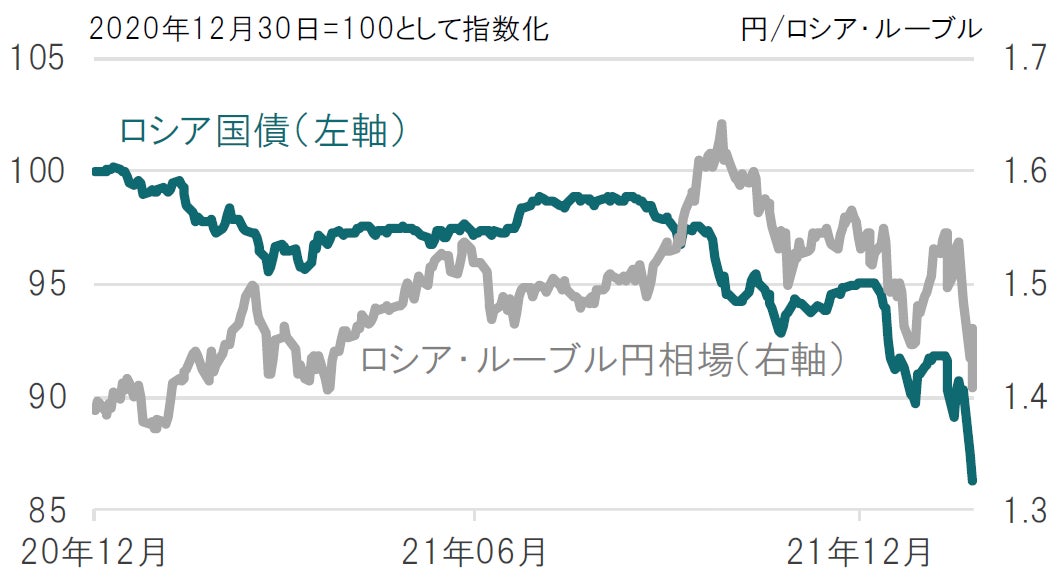 ウクライナ情勢への懸念を背景に、2021年10月以降ロシアの債券と通貨が下落