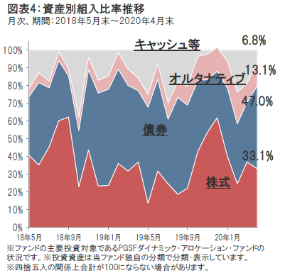 各国で大規模な金融・財政政策が打ち出されている他、一部の地域で経済活動再開への期待が高まったことなどから、株式市場は戻り相場となりました。しかし、当面、先行き不透明感は依然として高い為、当ファンドでは株式の組入れをやや抑制的な水準まで引き下げています。今後も慎重かつ機動的な運用を継続する方針です。