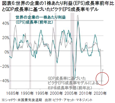 ピクテのモデルは、今年の1株あたりの利益(EPS)と配当が40%前後落ち込むことを予測しています(図表6参照)。2008~2009年のグローバル金融危機時のEPSはピクテの今年の予想と同程度の落ち込みとなりましたが、(世界が対応に苦慮する)足元のリセッションは、当時のリセッションの3倍~4倍に達するのではないかと懸念されます。