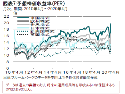 地域別では、スイスなどが注目されます。スイスは、ディフェンシブ・セクターの組入れが主要な株式市場の中で最も高い市場です。スイス株式のベンチマーク指数では、時価総額全体の60%以上を医薬品や生活必需品等のディフェンシブ銘柄が占め、その大多数が、コロナ危機下、市場全体を上回るリターンを上げています。 米国は、12ヵ月先の利益予想を用いて算出した株価収益率(PER)は、3月下旬の13倍台から4月末には19倍台と18年ぶりの水準に上昇しており(図表7参照)、世界の市場の中で最も割高な市場の一つとなっています。